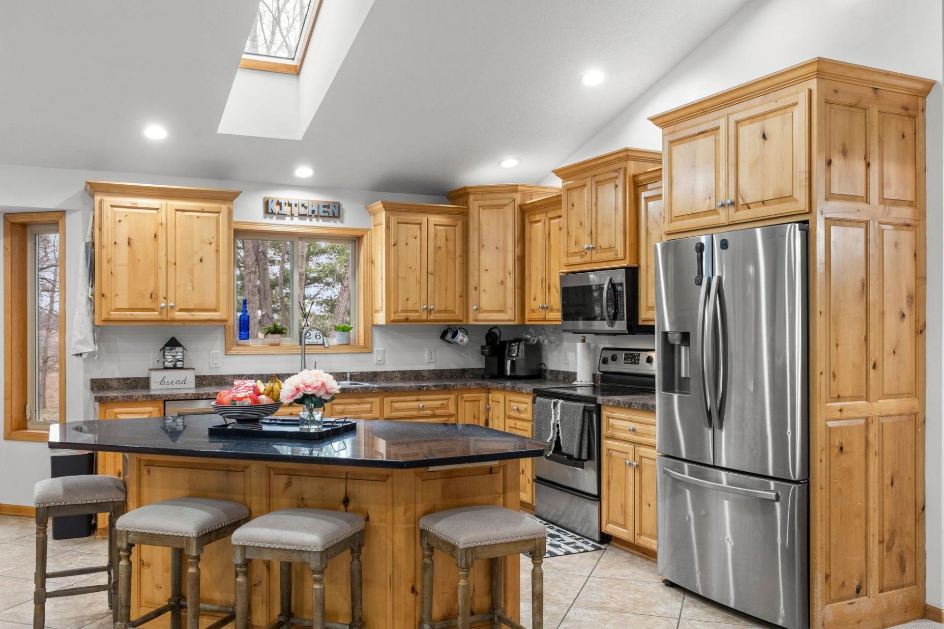 Experience the perfect blend of modern comfort and natural serenity in this updated 4-bedroom, 2-bathroom split-level home. Situated on a private 3.69-acre wooded lot filled with mature oaks, maples, and apple trees, the property offers stunning views of local wildlife and close proximity to Lake Fremont. The home features a heated and insulated 3-car attached garage, complete with its own thermostat, providing comfort and convenience year-round. Inside, the kitchen highlights knotty alder cabinetry, a large center island with a granite countertop, a bright skylight, and stainless steel appliances. The lower level serves as a premier retreat, housing a spacious family room with a gas fireplace and stone surround, alongside the primary bedroom suite. This level is also pre-wired for surround sound for an immersive media experience. Recent interior updates include new carpeting throughout. Notable exterior features include a freshly stained deck (2025) equipped with a direct LP gas line for grilling, an integrated security system with multiple exterior cameras, a dirt track for outdoor recreation, and a 12x12 storage shed. Additionally, the property will allow for an 1,800 sq. ft. pole barn, offering incredible potential for storage or a workshop.