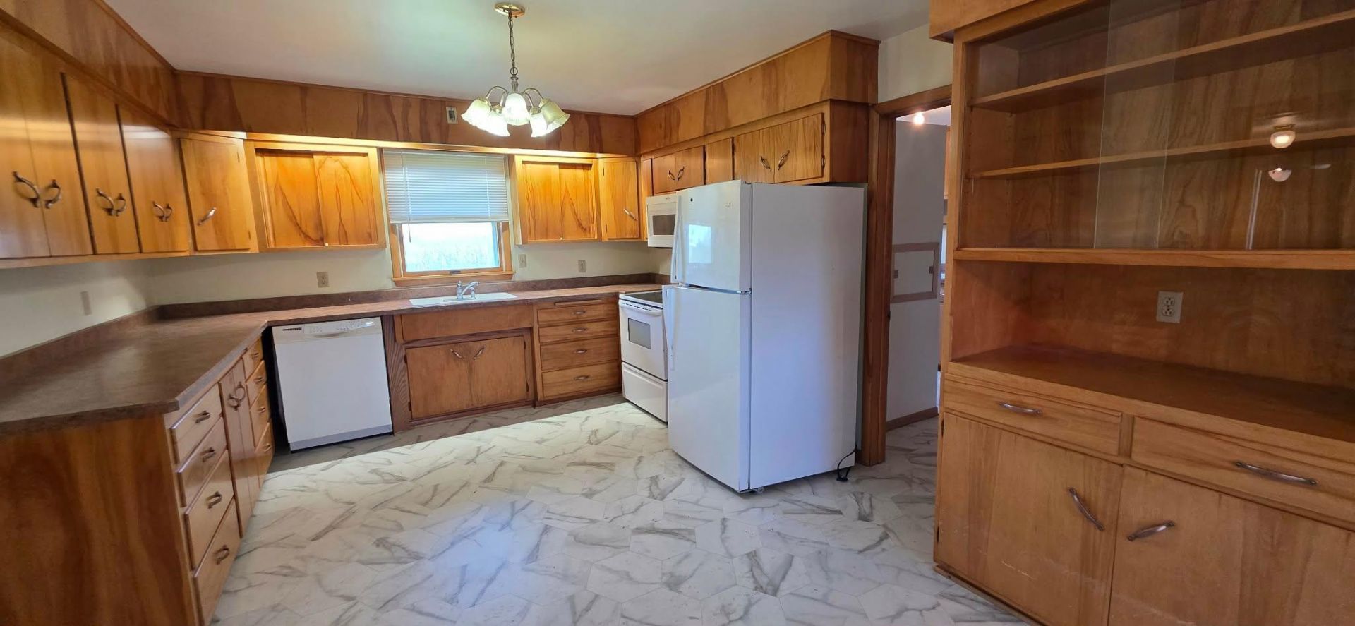 All of your living space is on one level in this built on slab home. This updated home has a new roof, newer furnace, air conditioner, water heater and appliances. This well kept home also has hardwood floors under the carpet, an attached garage and vinyl siding. The almost half acre lot has a great view of the park across the street from front porch and views that go forever from the back yard of the surrounding fields. Large rooms make this home easy to maneuver, the great views make it easy to sit down in and enjoy what's around you. The detached shed has a cement floor and is a great space for additional storage. Located on all paved roads.