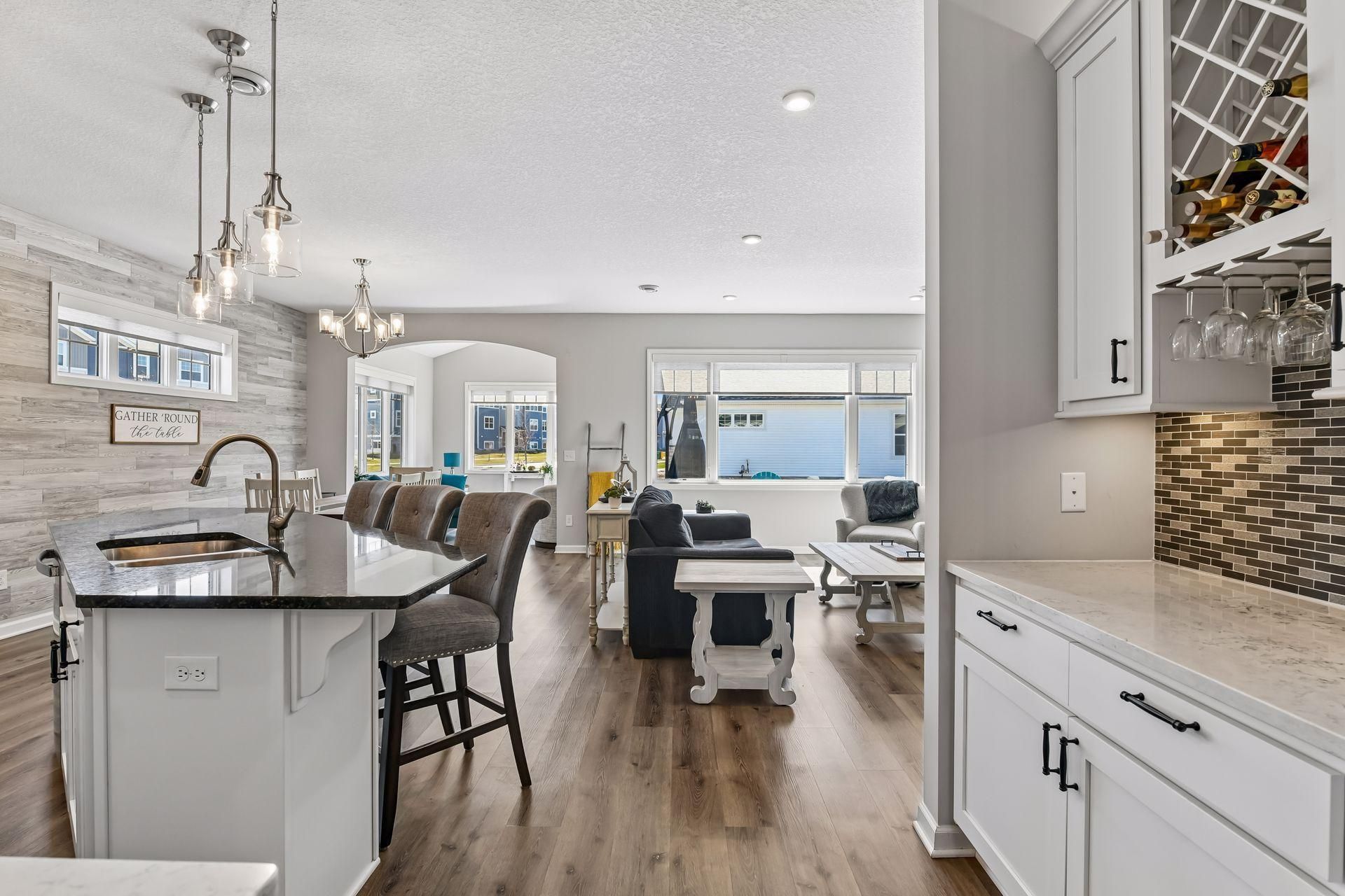 Don't miss your chance at exceptional one-level living in this 3BR/3BA Woodland Cove home, only 4yo! So many wonderful living spaces including a vaulted sunroom that opens to a private patio, a front office/flex room, and a bonus upper level. Spacious kitchen features a granite island w/ seating, beverage/coffee station, corner pantry closet, S/S appls, and tile backsplash. Great room is anchored by a gas fireplace w/ stately stacked stone surround. Primary BR suite features a private BA w/ tiled shower and walk-in closet. Custom roller shades throughout home. Insulated 3-car garage. Irrigation System. Neighborhood association maintains 2 in-ground pools, Clubhouse, multiple playgrounds, & many trails that connect up to area park systems like Carver Park Reserve. Don't miss out!