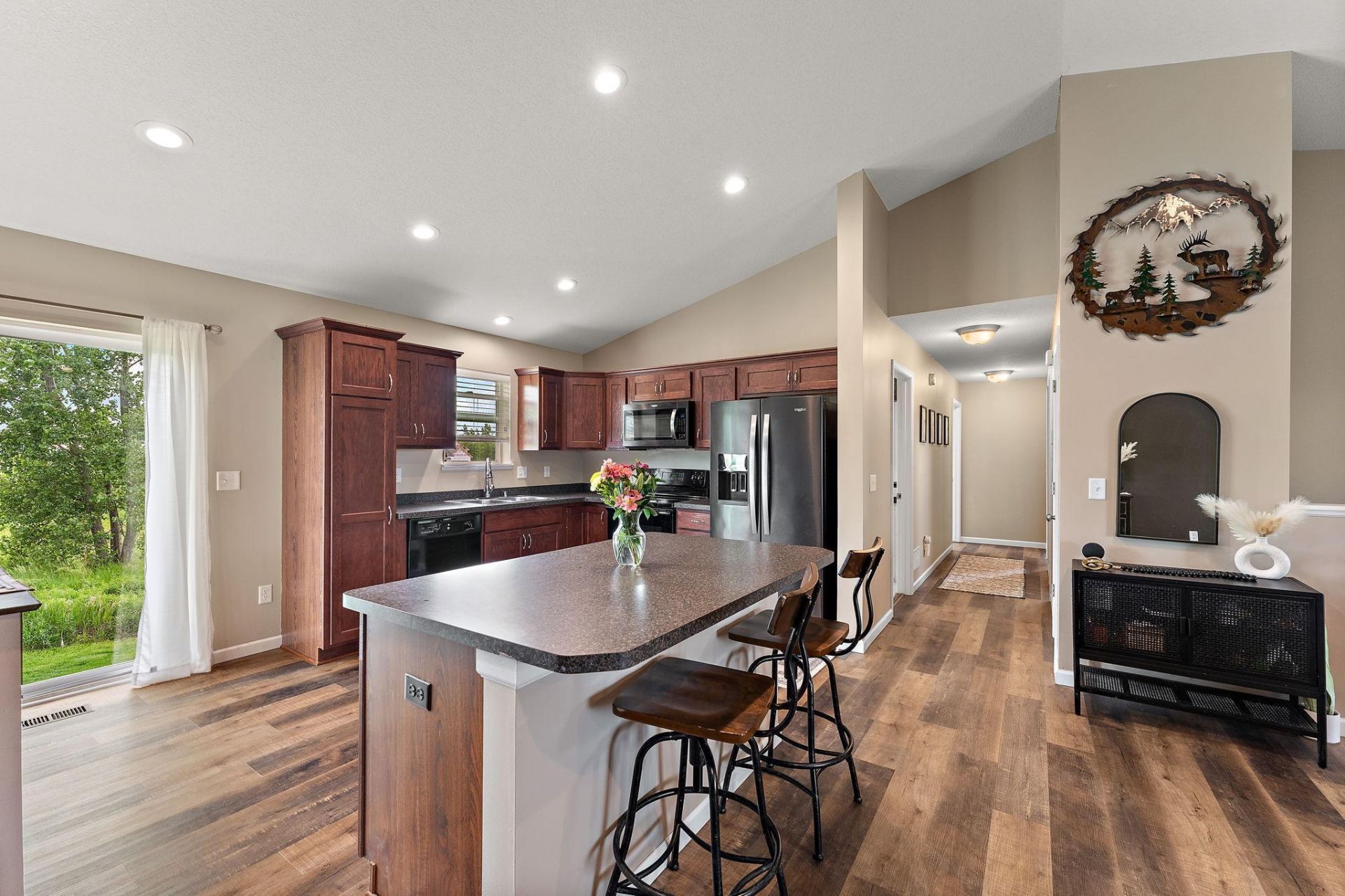 Fantastic home shows like a model! Huge floor plan is better than new as it is finished top to bottom and comes complete with gas fireplace, three garage stalls, finished lower level, and walkout to landscaped patio area! This roomy home has five bedrooms, three baths, flex room, huge family room, spacious kitchen and plenty of storage! New patio, finished lower level w/newly finished fireplace, new entry flooring plus new LL bath flooring. It is super clean and move-in ready! Beautifully finished main level has all new luxury vinyl flooring (23), vaulted ceiling, and large windows. Well-maintained with lots of windows and lovely finishes - a happy home! Spacious kitchen has plenty of cabinets, center island, wall pantry and kitchen window. Dining room has new recessed lights and patio door overlooking the backyard. Additional storage pantry in hallway. Primary suite with walk-in closet, ceiling fan, and private full bath. Two more bedrooms on main offer options for your home office, exercise room or more. Lower-level is well laid out with plenty of space. Large family room is ready for entertaining or game day! Beautiful new luxury vinyl flooring on lower level (24), recessed lights, walks out to the new 14 x 12 patio and landscaped backyard. Room to add a snack bar if desired. Stone fireplace is newly finished including new mantle. Flex room offers space for your home office or playroom. Two additional bedrooms are spacious with large closets. Updated in lower-level three-quarter bathroom and new flooring (25). Washer and Dryer (23) included. Wonderfully maintained and updated! Move in and enjoy! Welcome home!