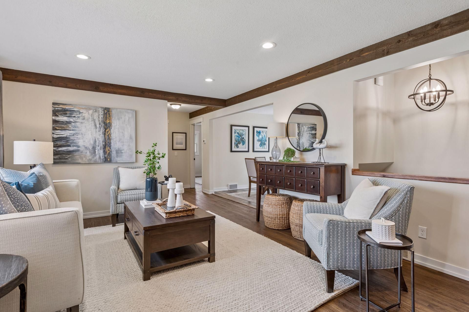 Welcome to this warm and inviting beautifully updated rambler in New Hope! Step inside and be greeted by refinished hardwood floors & LVP Flooring, dark wood beam accents, and a stunning floor-to-ceiling stone fireplace in the living room. The space flows effortlessly through the dining room and into the updated kitchen, complete with rich wood cabinetry, granite countertops, a stylish tile backsplash, and a full suite of stainless steel appliances including a gas range. A formal dining room rounds out this level, perfect for gatherings.One of the true highlights of this home is the incredible 4-season porch, which features a vaulted natural wood ceiling, two oversized sliding glass doors, and a charming wood-burning stove set against a stone accent wall. Flooded with natural light and overlooking the private backyard, this space is truly one of a kind. Two bedrooms and a beautifully updated full bathroom complete the main level.The lower level features a spacious family room with a second stone fireplace, two additional bedrooms, a 3/4 bath, and laundry, all with a walkout to the backyard patio. Outside, enjoy a large deck, a patio below, and a beautifully private, wooded backyard that backs up to Basset Creek trail and Northwoods Park. Recent updates include refinished hardwood floors, new flooring throughout, fresh paint and new light fixtures. A heated 2-car garage rounds out this move-in ready package. Conveniently located near parks, trails, shopping, and dining, with easy access to Hwy 169 and 694, and just minutes to Minneapolis. Don't miss this one, schedule your showing today!
